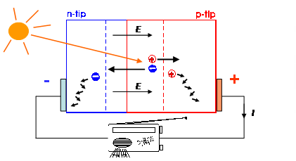 V osvetljeni sončni celici se generirajo pari elektron-vrzel. Električno polje loči in povleče elektrone iz prehodnega področja v polprevodnik tipa n in vrzeli v polprevodnik tipa p. Elektroni in vrzeli se nato v nevtralnem delu polprevodnika s pomočjo difuzije premikajo proti kontaktoma. Ločitev elektronov in vrzeli povzroči napetostno razliko na kontaktih, ki ob priključitvi porabnika požene električni tok.