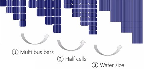 Za še višjo učinkovitost fotonapetostnih modulov, se v zadnjih letih uveljavljajo rešitve z rezanimi celicami. Istočasno pa se je povečala tudi velikost sončne celice. Najbolj pogoste so danes sončne celice iz silicijevih rezin velikosti med M4 in M6. Posamezni nizi zaporedno vezanih polovičnih sončnih celic so v modulu vezani vzporedno. kar izboljša odziv modula v delno senčenih pogojih, hkrati pa so njihove električne karakteristike podobne klasičnim modulom s celimi sončnimi celicami.