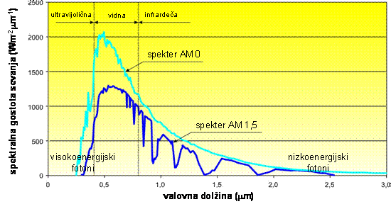 Standardizirana spektra sončnega sevanja (AM0 – zunajzemeljski, AM1.5 – na Zemlji)