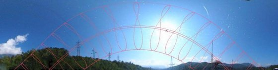 Slika 1: Digitalni posnetek okolice PV generatorja z vrisano najvišjo, srednjo in najnižjo potjo Sonca.