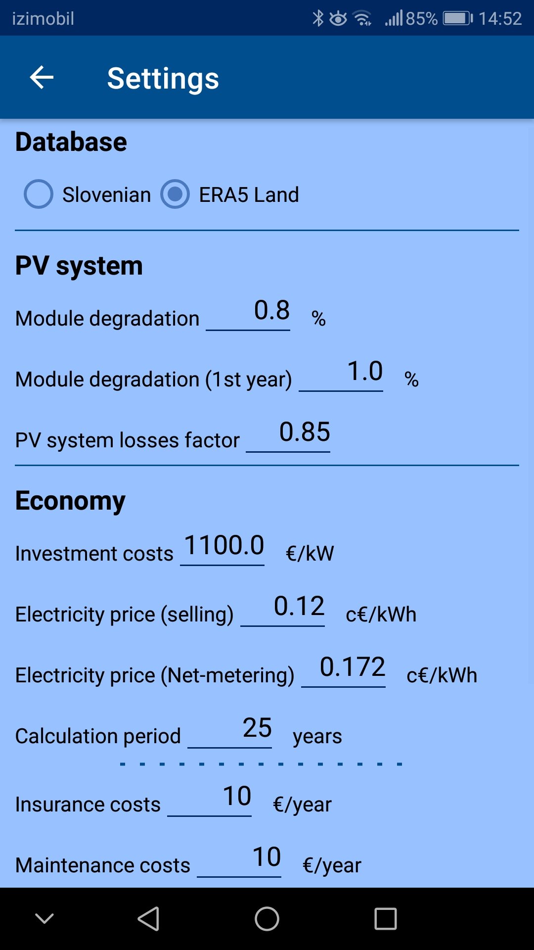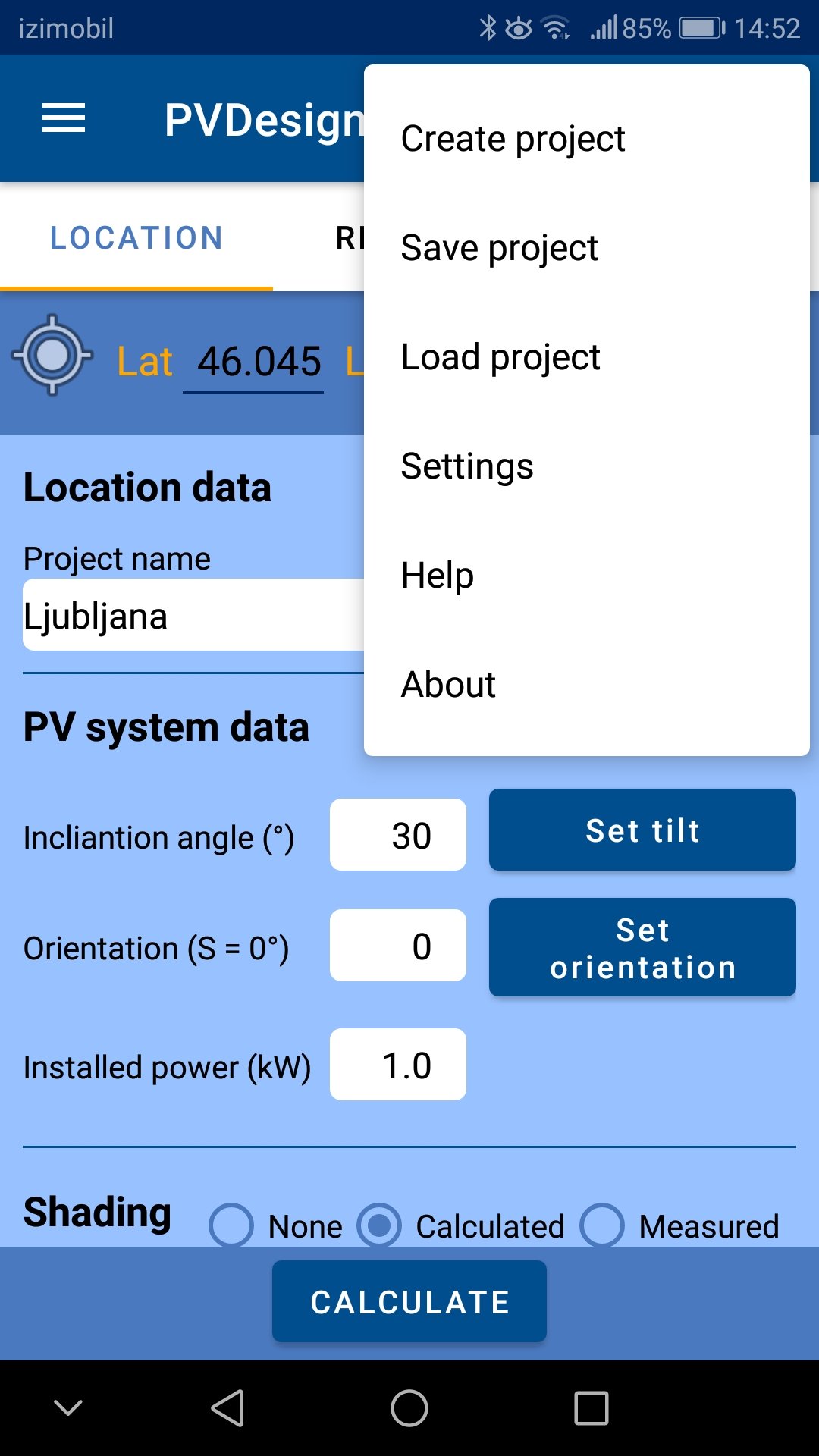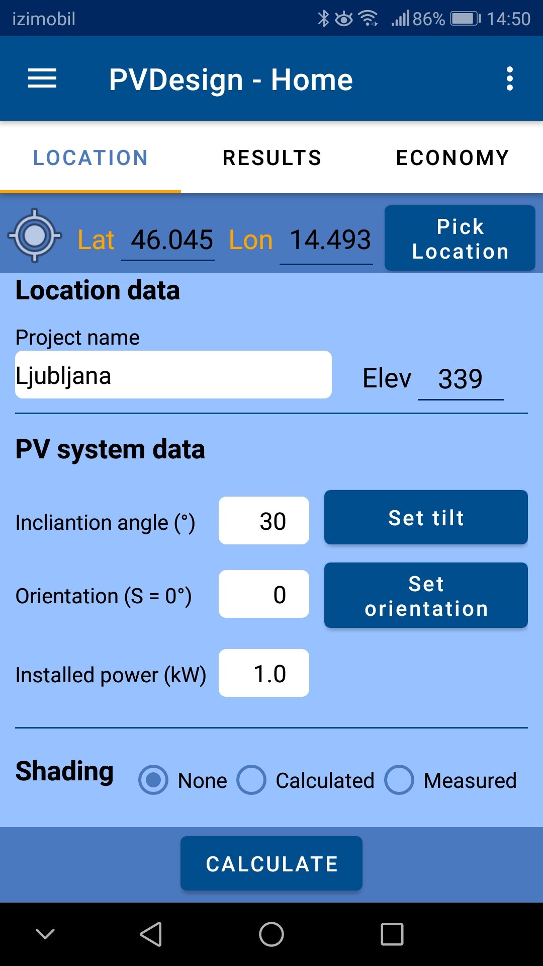 Na začetni strani vnesete osnovne podatke o lokaciji elektrarne in s pomočjo gumbo Izračunaj/Calculate izračunate donos sončne elektrarne. Za določitev naklona, orientacije in horizonta je potrebna kalibracija telefona. Za kalibracijo senzorjev sledite splošnim kalibracijskim navodilom (vrtenje telefona okoli vseh treh osi).