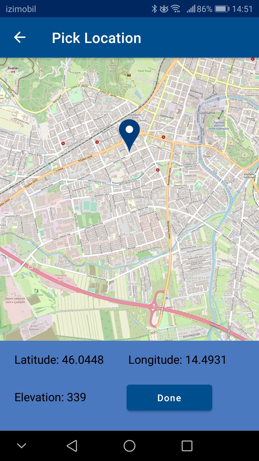 Določitev lokacije: Lokacija vaše naprave se prebere ob zagonu programa. V primeru, da GPS lokacija ni znana oz. GPS senzor ni bil vkopljen lahko trenutno lokacijo vnesete ročno ali po uspešnem geolociranju telefona s pritiskom na gumb