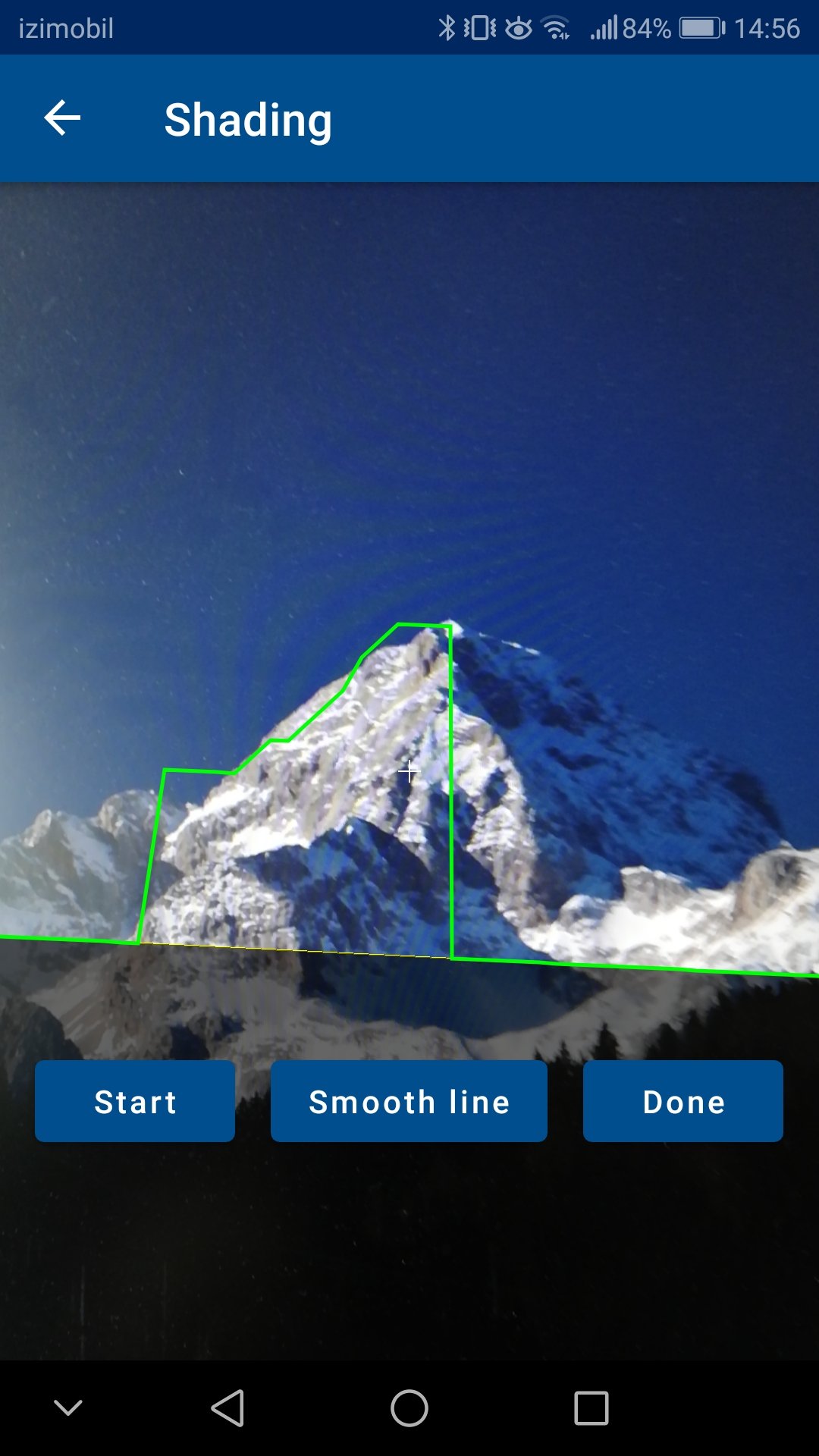 Senčenje: Začenete orodje za snemanje horizonta. Na ekranu pritisnete gumb start in pričnete s snemanjem horizonta s tem, da se gibljete okoli svoje osi. Horizont se posname tako, da križec na stredini zaslona sledi oviram, ki jih prikazuje kamera. Profil se shrani le v primeru, če je bil prej kreiran projekt.
