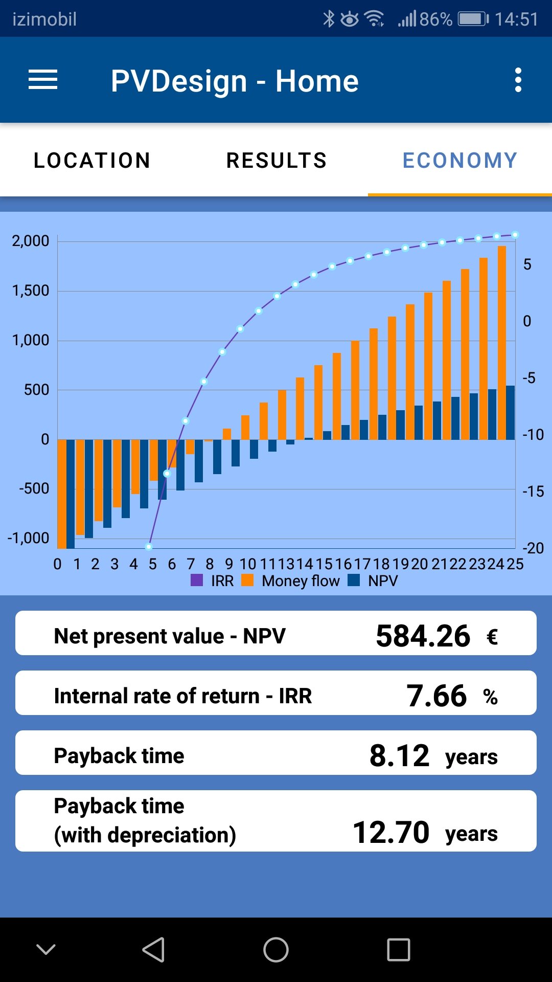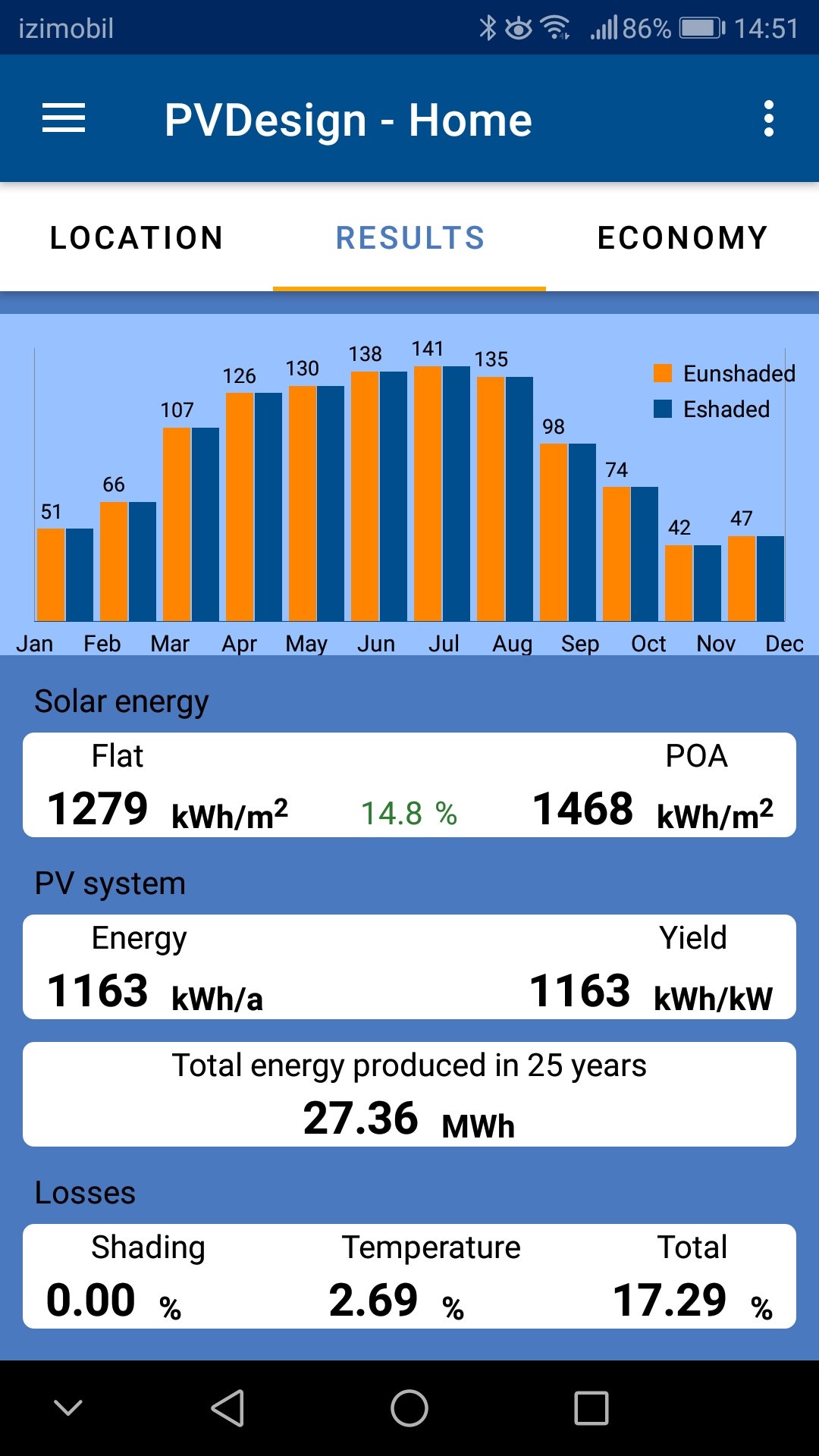 Rezultati: Rezultati ponujajo letno sončno obsevanje na vodoravno površino in v ravnino modulov, donos in izplen sončne elektrarne ter okolske parametre in enostavno vračilno dobo. Polna verzija vsebuje tudi izračun diskontirane vračilne dobe in stopnje donosa.