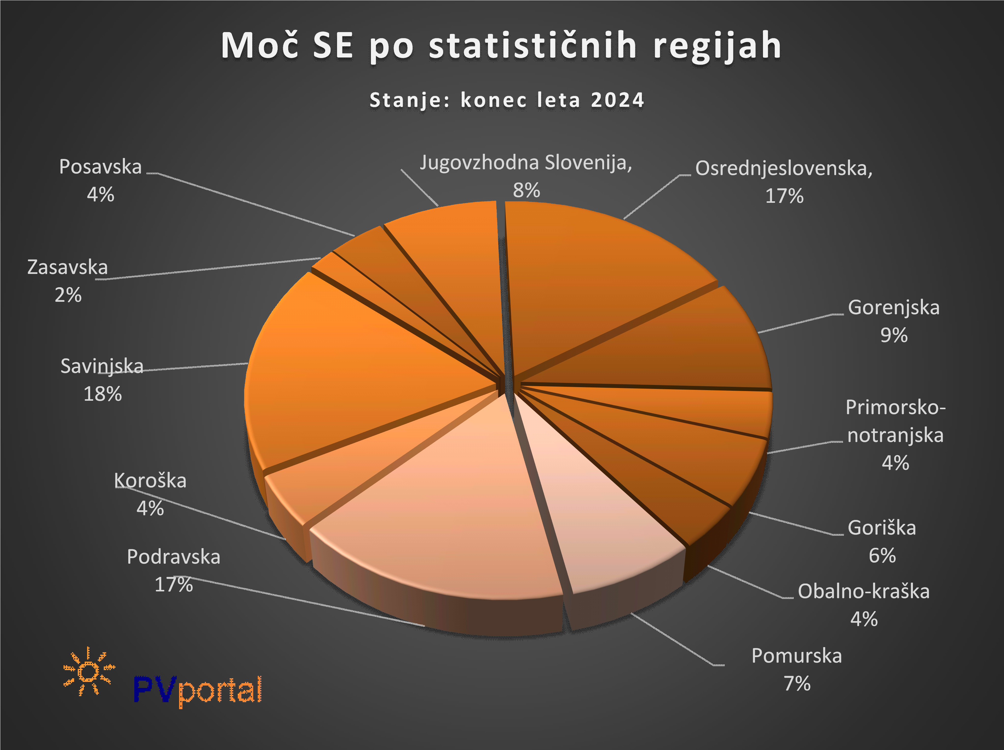 Pri regijah je prvo mesto prevzela savinjska regija z 19%, sledita ji podravska in osrednjeslovenska regija s po 17%. Najmanj elektrarn je v zasavski regiji. Glede na nameščeno moč na prebivalca z več kot 1000 W/preb vodi primorsko-notranjska regija. Slovensko povprečje je 668 W/preb, kar nas po preliminarnih podatkih uvršča med prvih 6držav v Evropski uniji.