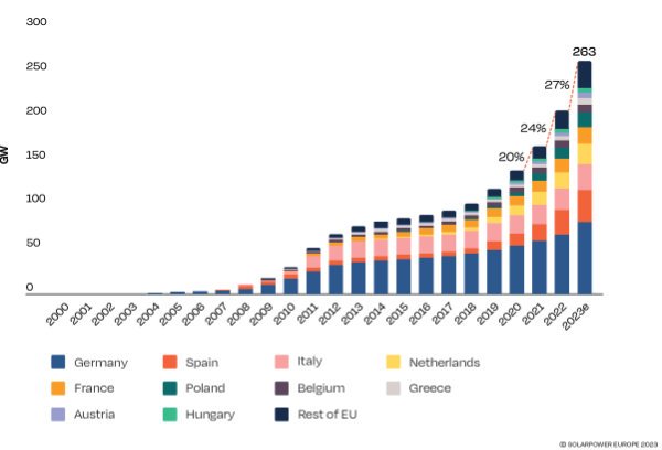 Letna rast PV v Evropu (EU-27) je v letu 2023 znašala 27%. Skupna moč vse sončnih elektrarn v EU je tako dosegla 263 GW. Prvih 100 GW je Evropa dosegla v letu 2018, štiri leta kasneje je bilo nameščenih 200 GW sončnih elektrarn. Med prvimi desetimi državami po inštalirani moči ni večjih sprememb. Na prve mestu je Nemčija, sledijo ji Španija, Italija in Poljska. Iz prve deseterice je lani izpadla Dansko, zamenjala jo je Avstrija. Štiri nove države so presegle 1 GW, med njimi tudi Slovenija. Trenutno je le še 7 držav v EU pod mejo 1 GW.