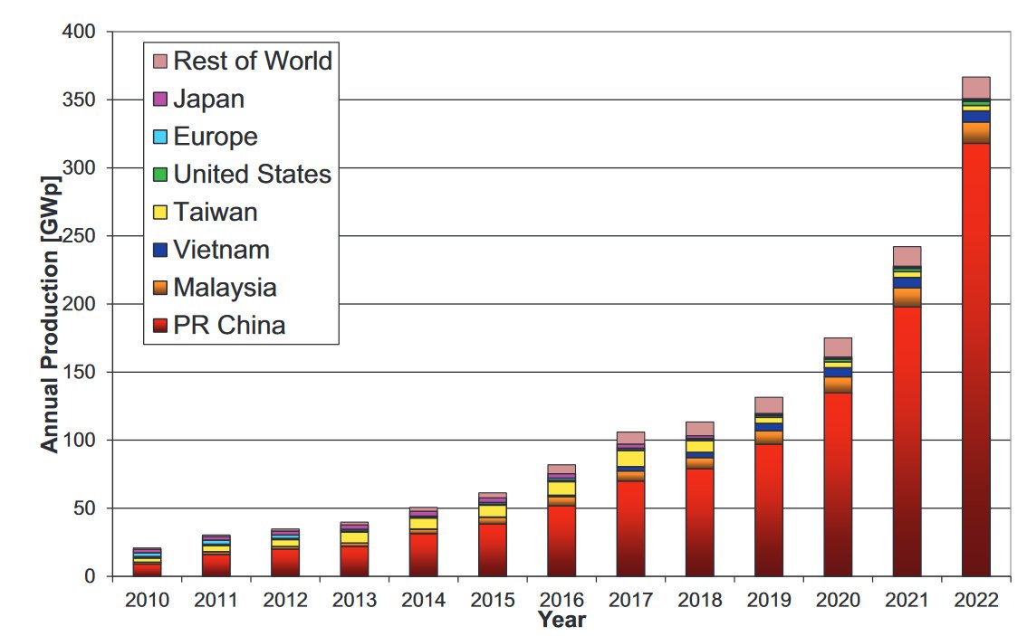 Večino PV modulov je proizvedenih na Kitajskem (77,8% v letu 2022), sledita ji Vietnam (6,4%) in Malezija (2,8%). Indija, ZDA in Južna Koreja proizvedenjo po 1,9% svetovne proizvodnje, celotna Evropa pa le 0,6%.