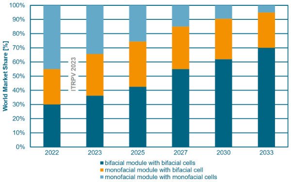 Glede na izvedbo sprenjega in zadnjega kontakta na trgu prevladujejo dvostranske sončne celice. Njihov delež v letu 2023 je bil že okoli 70%.