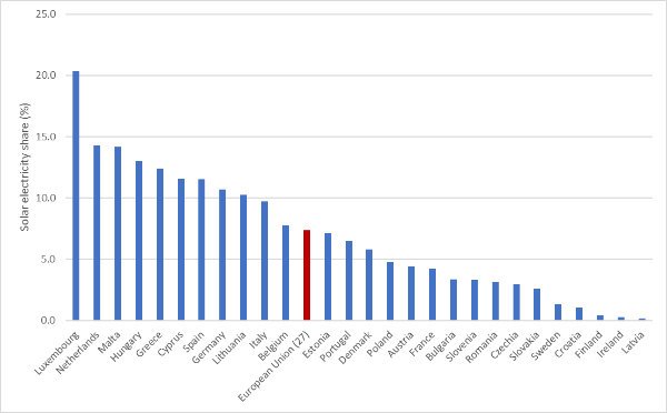 Največji delež fotonapetostne električne energije v svoji porabi je v letu 2023 imel Luksemburg (20.3%), sledita u Nemčija in Malta z nekaj več kot 14%. Slovenija je bila v letu 2022 na 19 mestu s 3.3%. EU-27 povprečje je 7.4%.